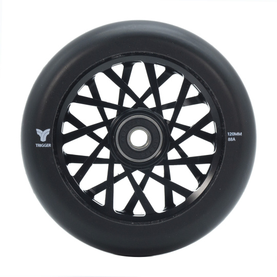 Découvrez les incroyables performances des roues Trigger Star noires, mesurant 120 mm x 24 mm / 88A, spécialement conçue pour la trottinette freestyle en street, skatepark et rampe, alliant un design étoilé à une ingénierie de pointe.